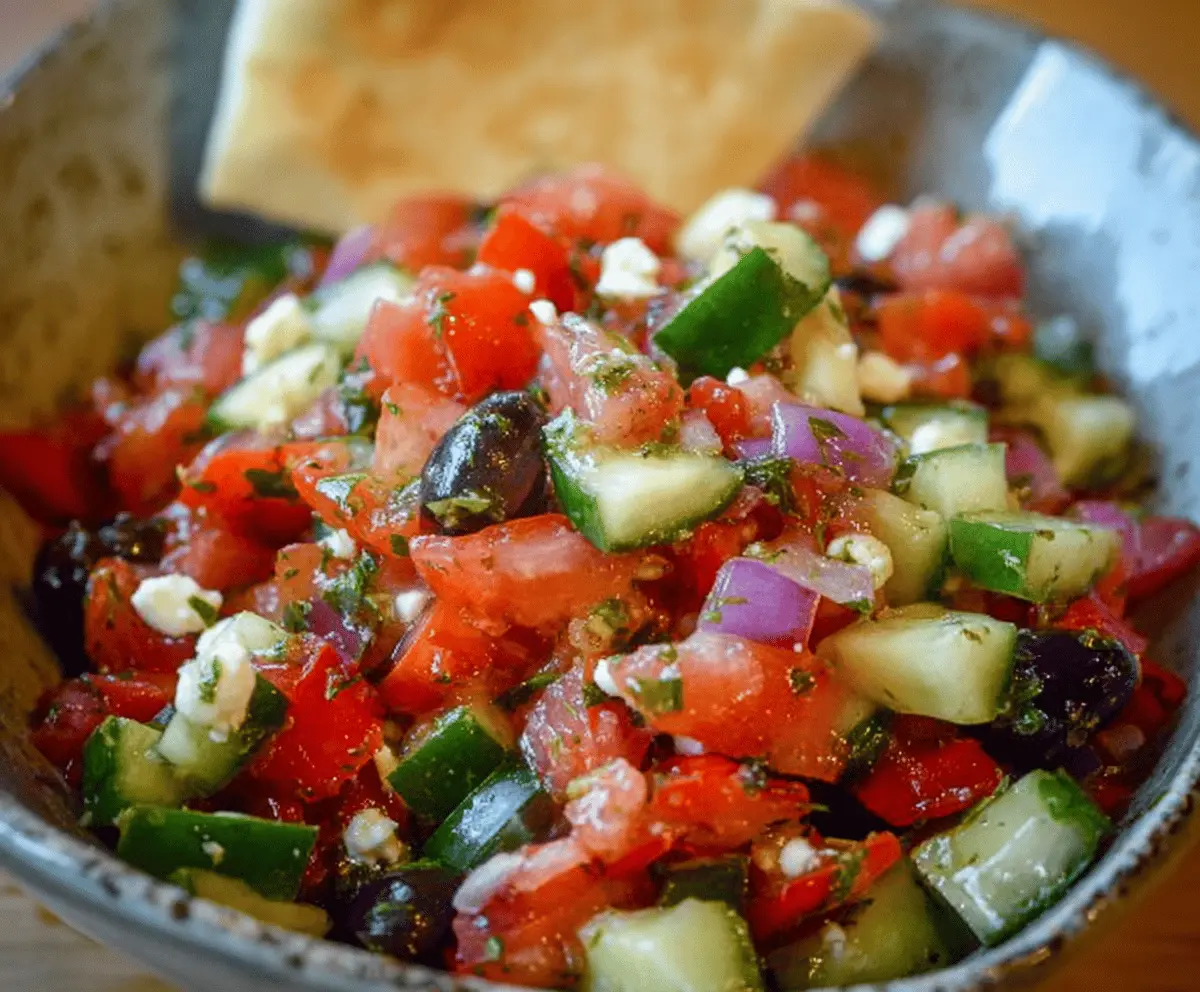 This Fresh and Zesty Greek Salsa is a colorful mix of ripe tomatoes, crunchy cucumbers, tangy feta cheese, and a splash of lemon juice. Perfect for jazzing up your meals!